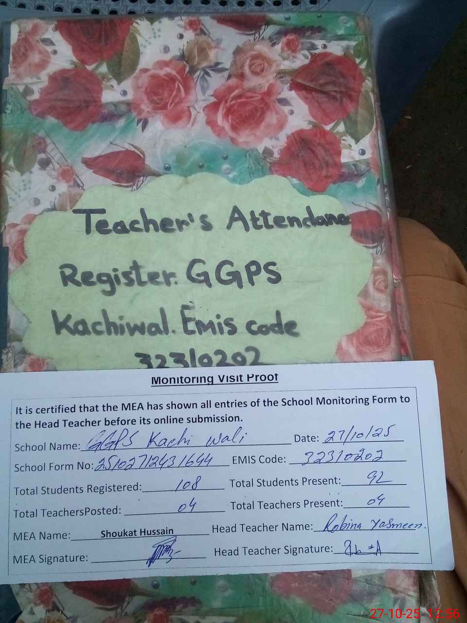 | Attendance Register | Head Teacher | MEA with School | Visit Proof |