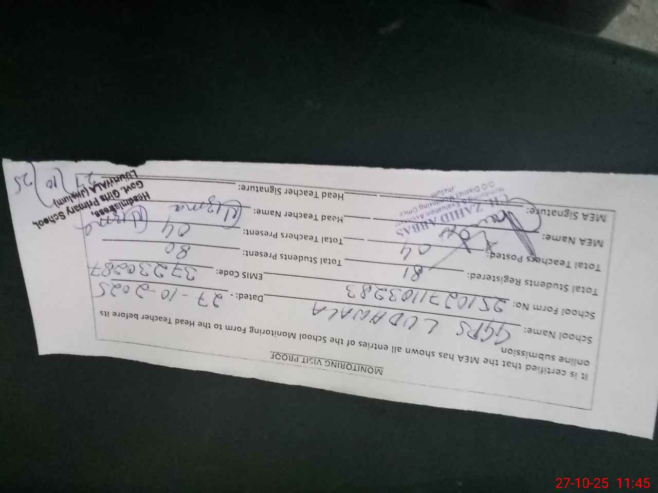 | Monitoring Date: 27-10-2025 | Start Time: 27-10-2025 11:03 AM | End Time: 27-10-2025 11:51 AM | Name of MEA: Za**** Ab**** | |