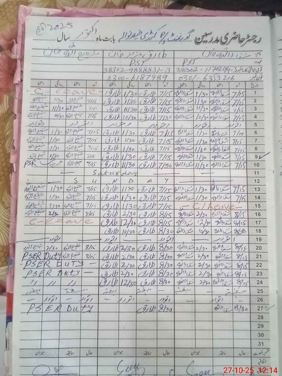 | CNIC | Full Name | Designation | R/C | Absence During Last Calender Month |