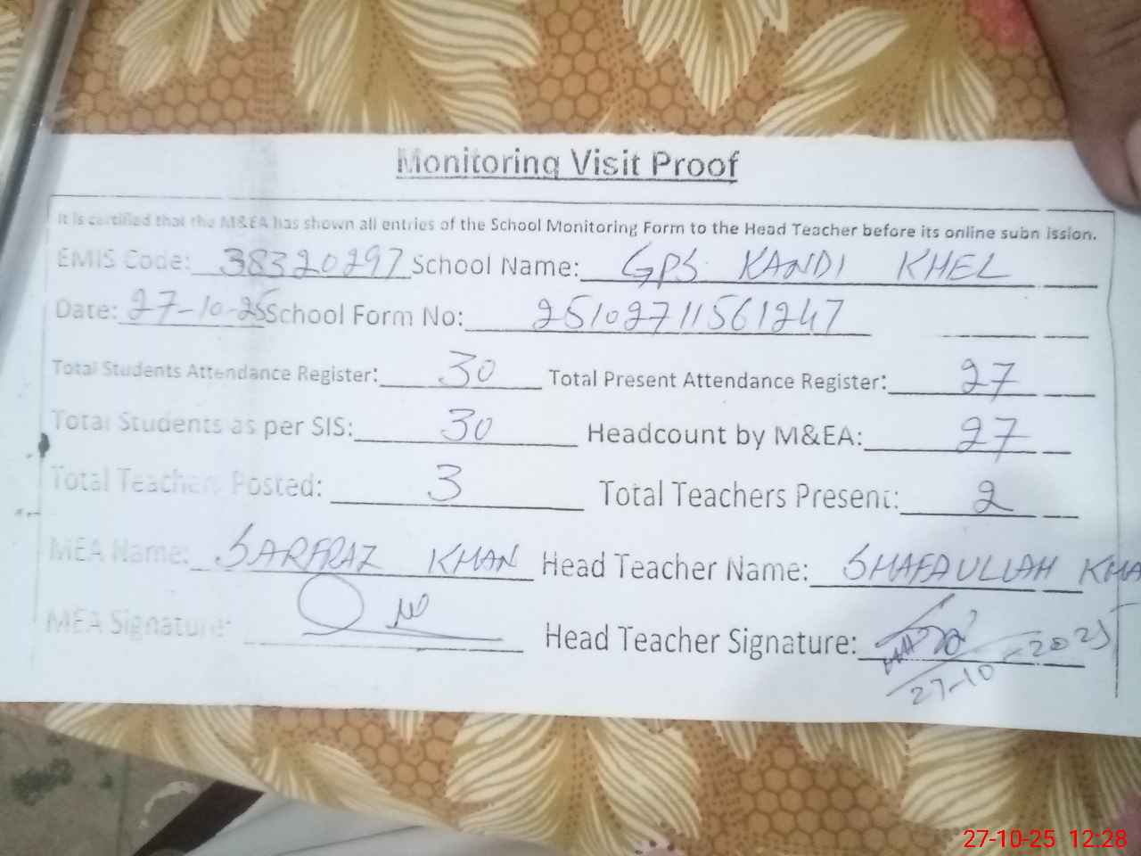 | Attendance Register | Head Teacher | MEA with School | Visit Proof |