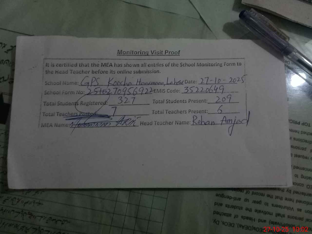| Attendance Register | Head Teacher | MEA with School | Visit Proof |