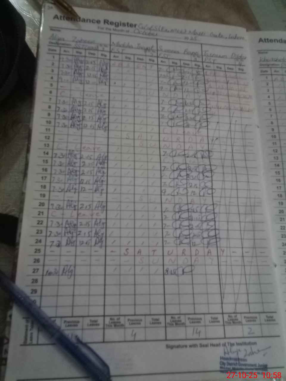 | Remarks (Use Separate Page if Required): Head Teacher Aliya Zaheen SSTcame in school at 1030 so marked her absent MADHIA EST FOUND LONG ABSENT WEF 17 03 2025 TO TILL DATE KHURSHIDA PST FOUND LONG ABSENT WEF 01 06 25 TO TILL DATE | |||||