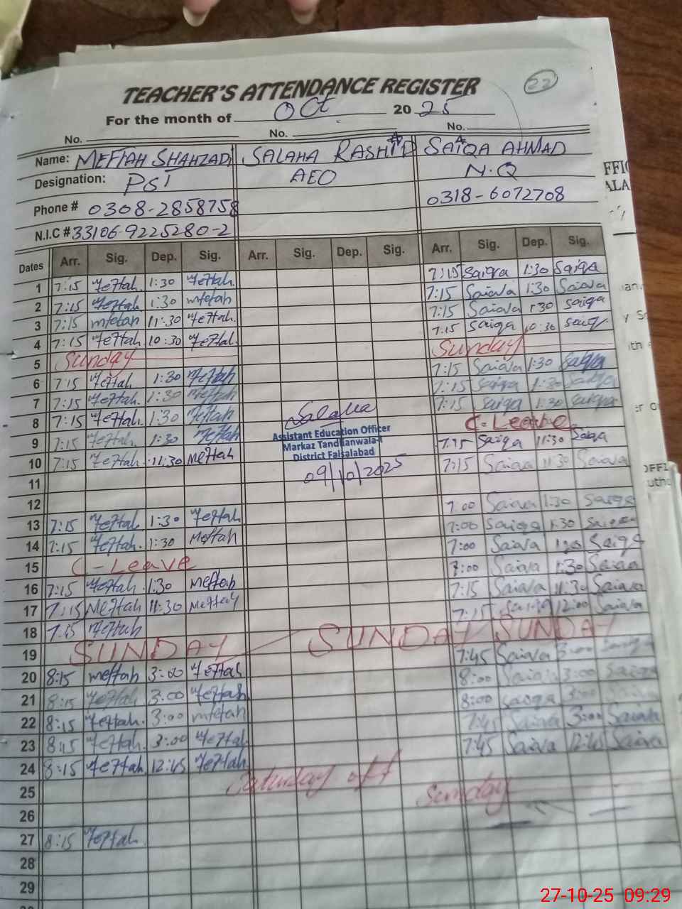 | CNIC | Full Name | Designation | R/C | Absence during last cal. month |