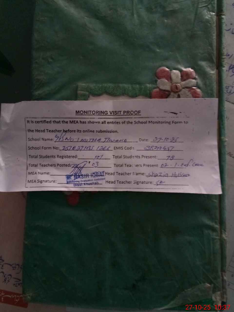 | Attendance Register | Head Teacher | MEA with School | Visit Proof |