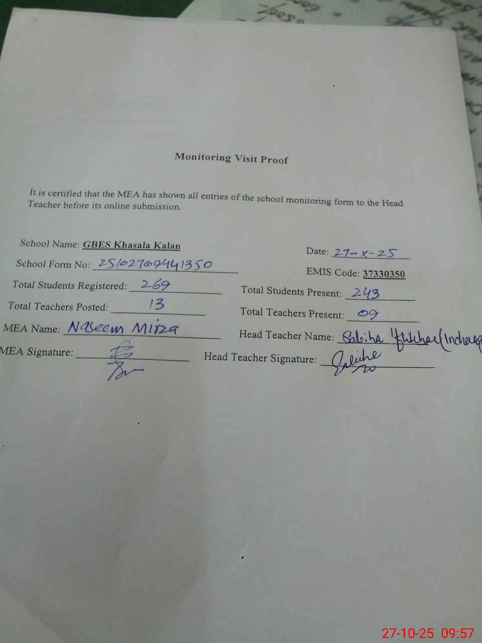 | Attendance Register | Head Teacher | MEA with School | Visit Proof |