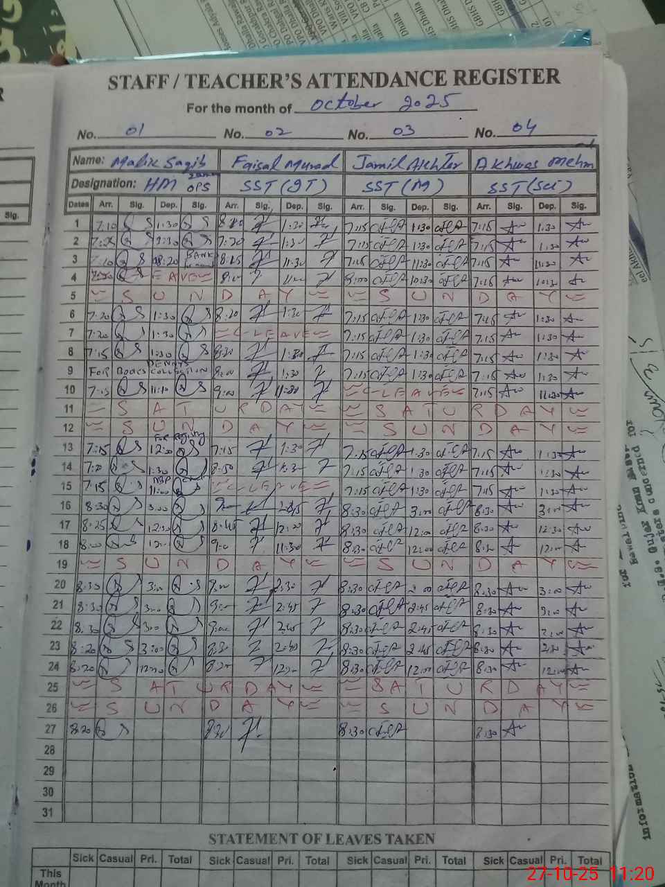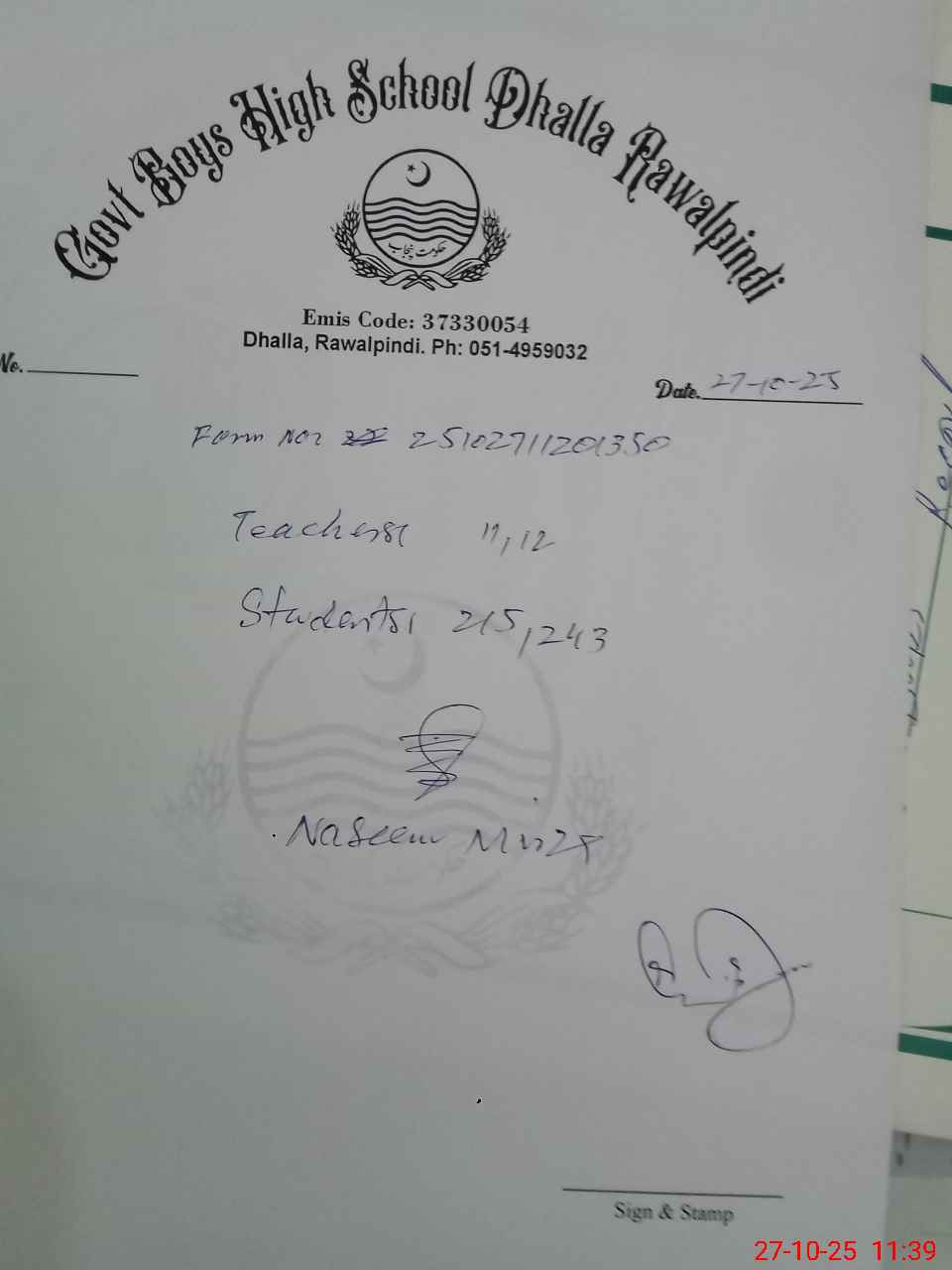 | Remarks (Use Separate Page if Required): Mr Atif Iftikhar est has been absent from school since 10 September 2025 and his absentee report has been sent to concerned authorities by the headmaster and he is still waiting for response from authorities the above mentioned teachers remained in different duties like ECP and examinations duties etc and his present and working days in school are very less | |||||
