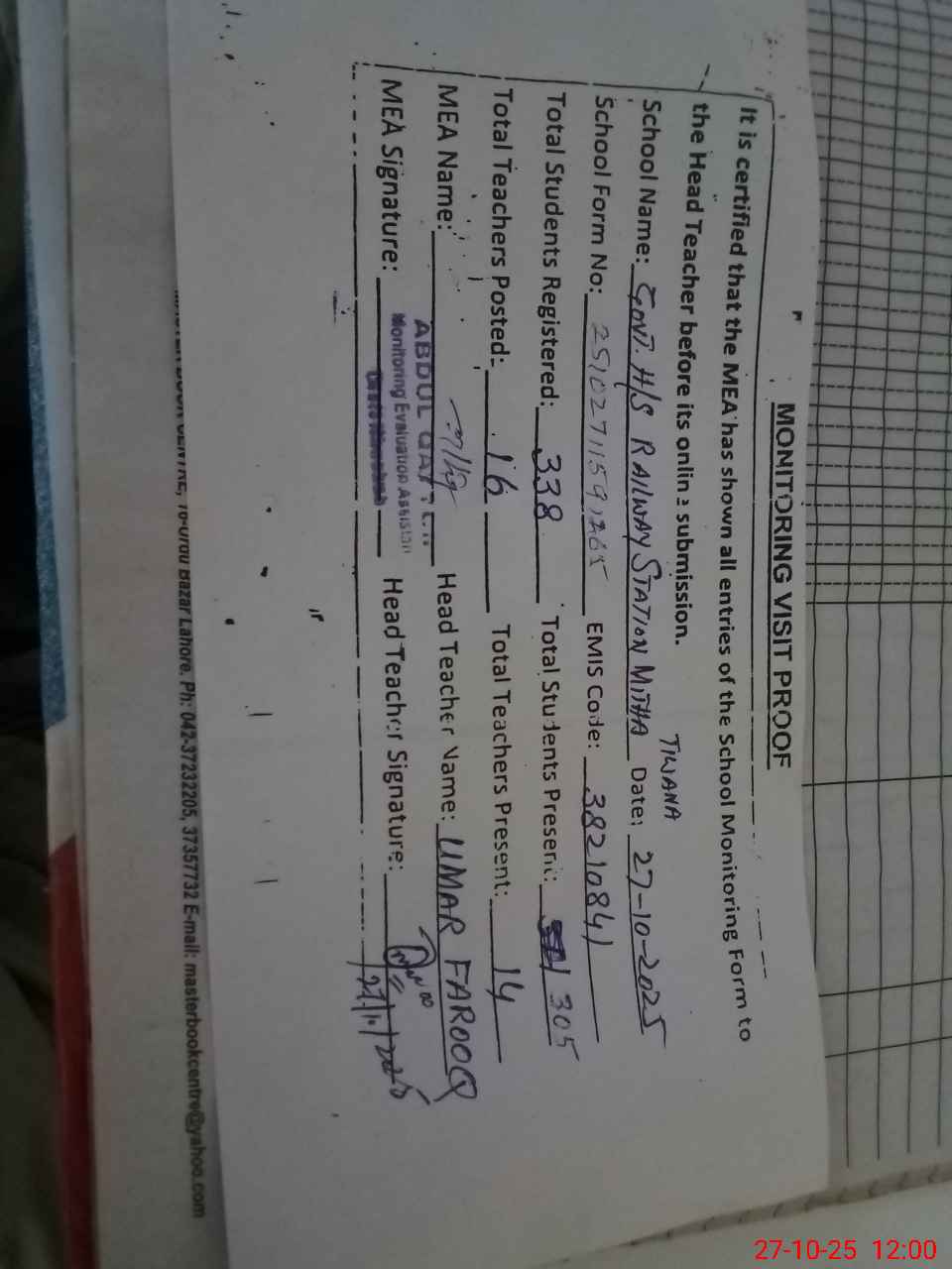 | Attendance Register | Head Teacher | MEA with School | Visit Proof |