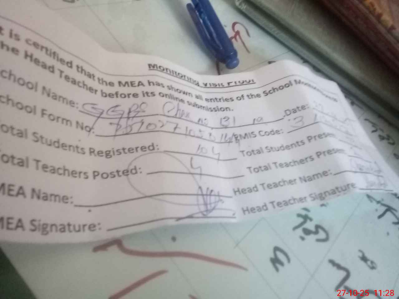 | Attendance Register | Head Teacher | MEA with School | Visit Proof |