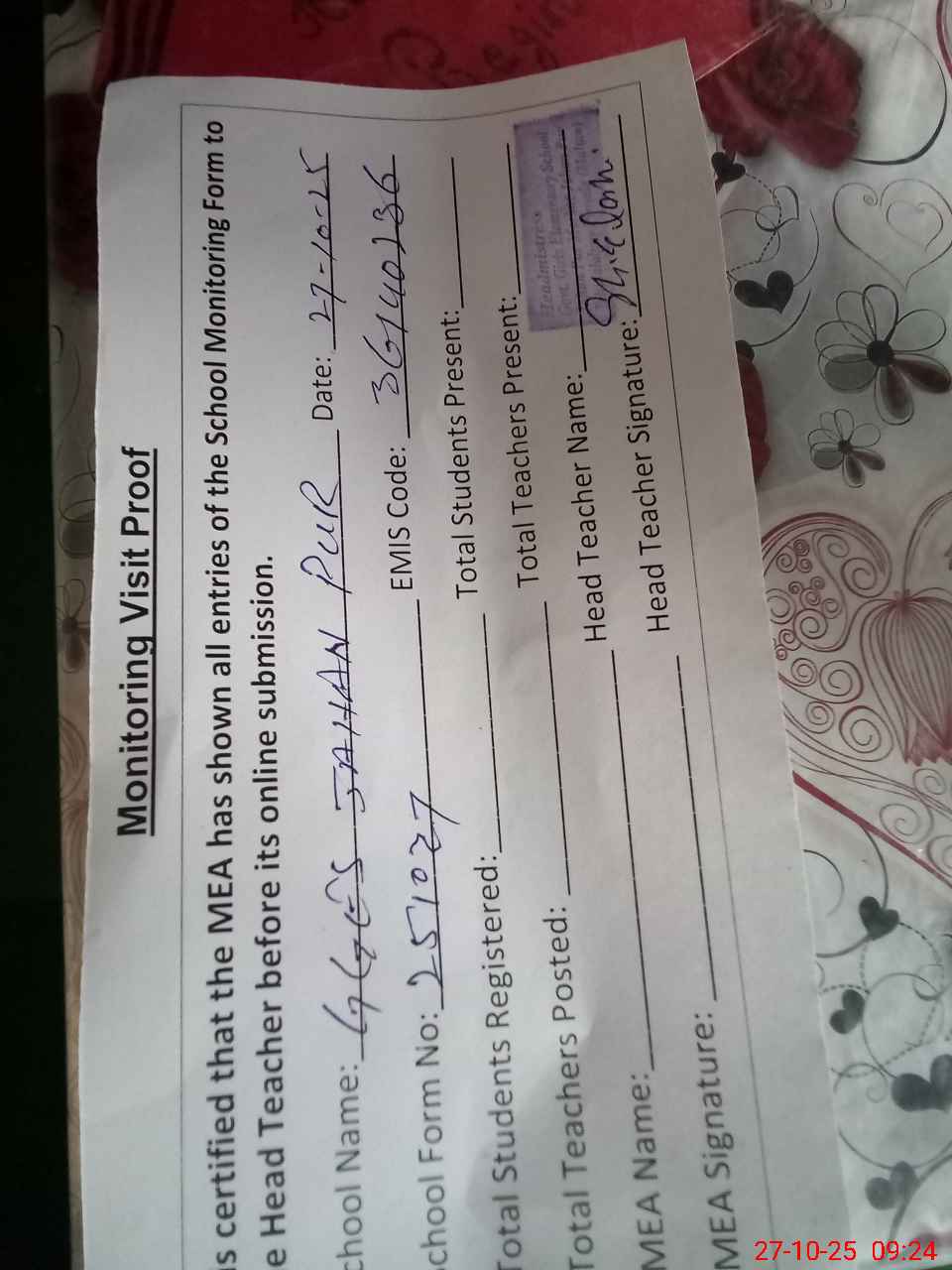 | Attendance Register | Head Teacher | MEA with School | Visit Proof |