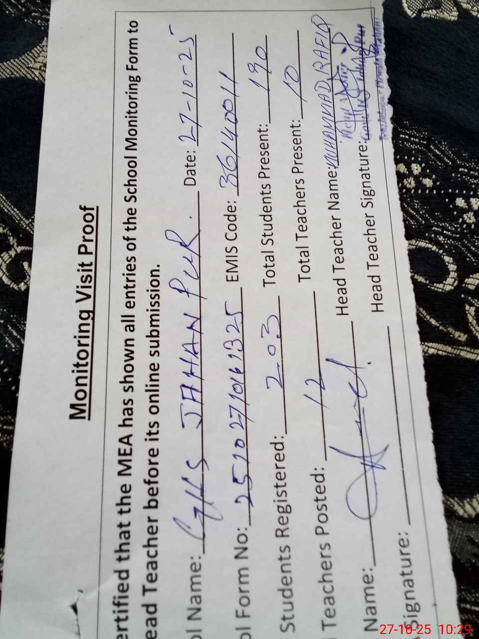 | Attendance Register | Head Teacher | MEA with School | Visit Proof |
