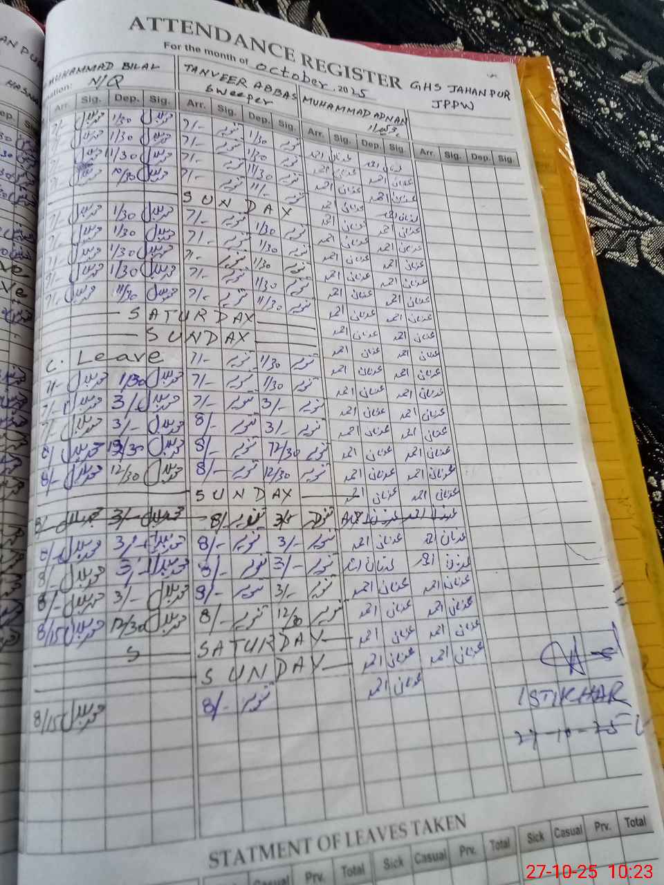| CNIC | Full Name | Designation | R/C | Absence During Last Calender Month |