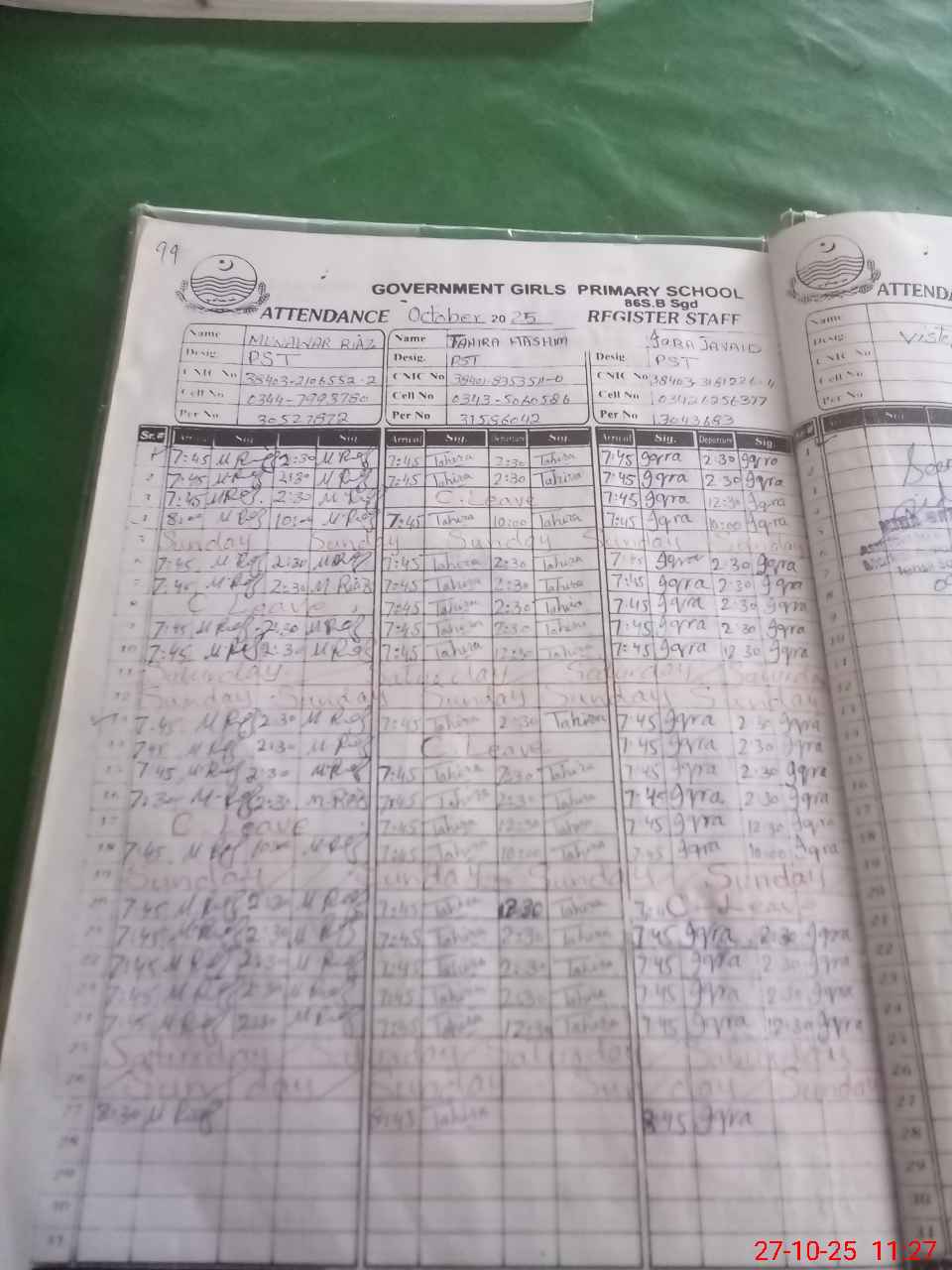 | CNIC | Full Name | Designation | R/C | Absence During Last Calender Month |