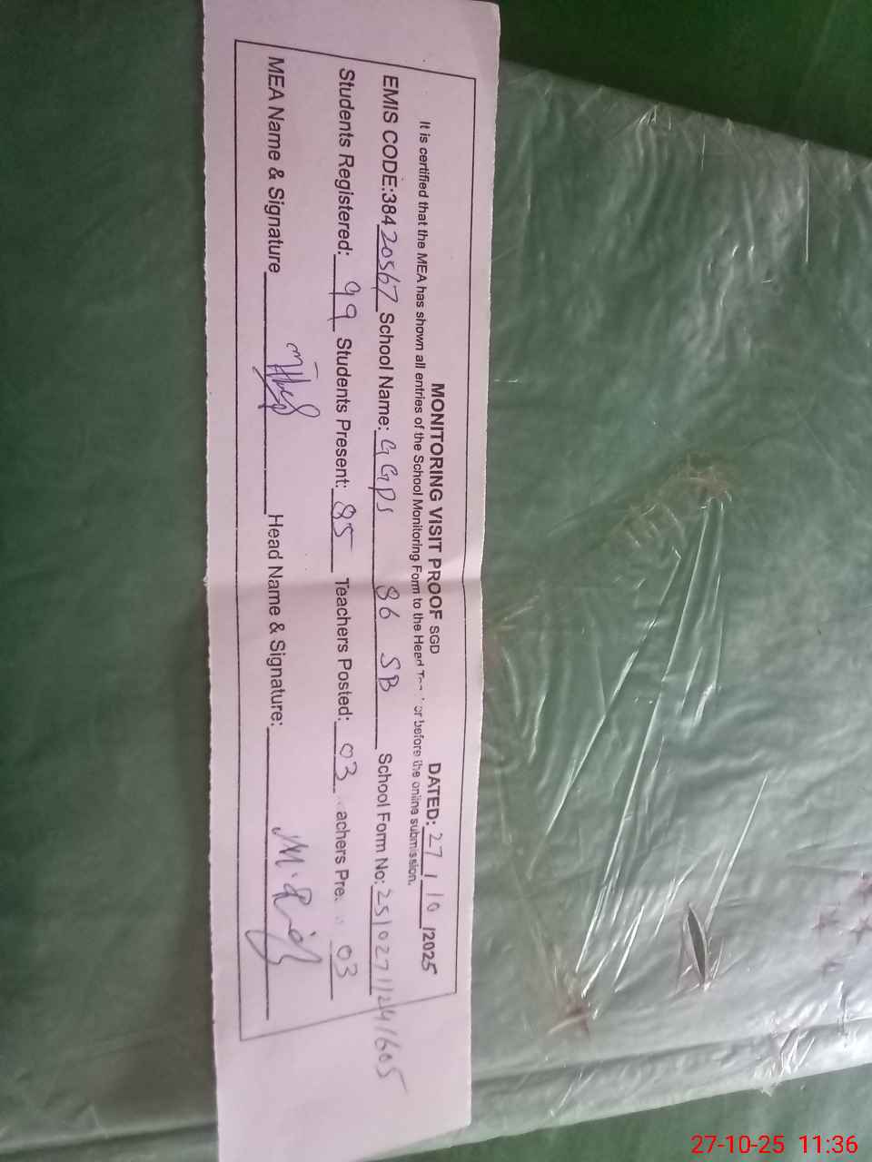 | Attendance Register | Head Teacher | MEA with School | Visit Proof |