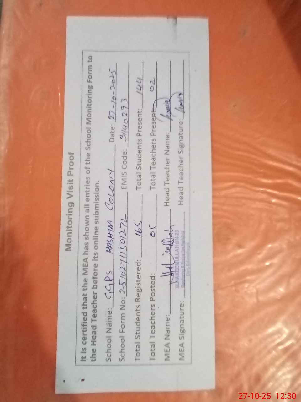 | Attendance Register | Head Teacher | MEA with School | Visit Proof |