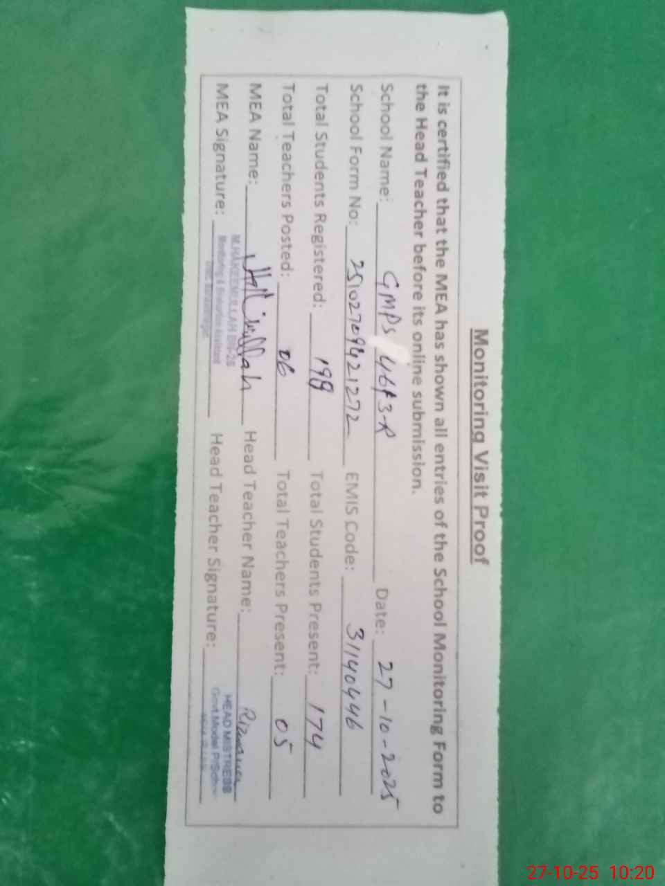 | Certified that this School was Inspected by the Undersigned MEA/DMO Today and the Information Stated Above is as Per Record. | |||||