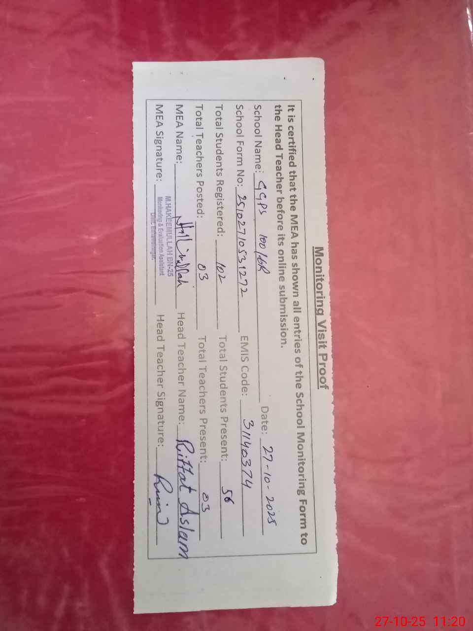| Attendance Register | Head Teacher | MEA with School | Visit Proof |