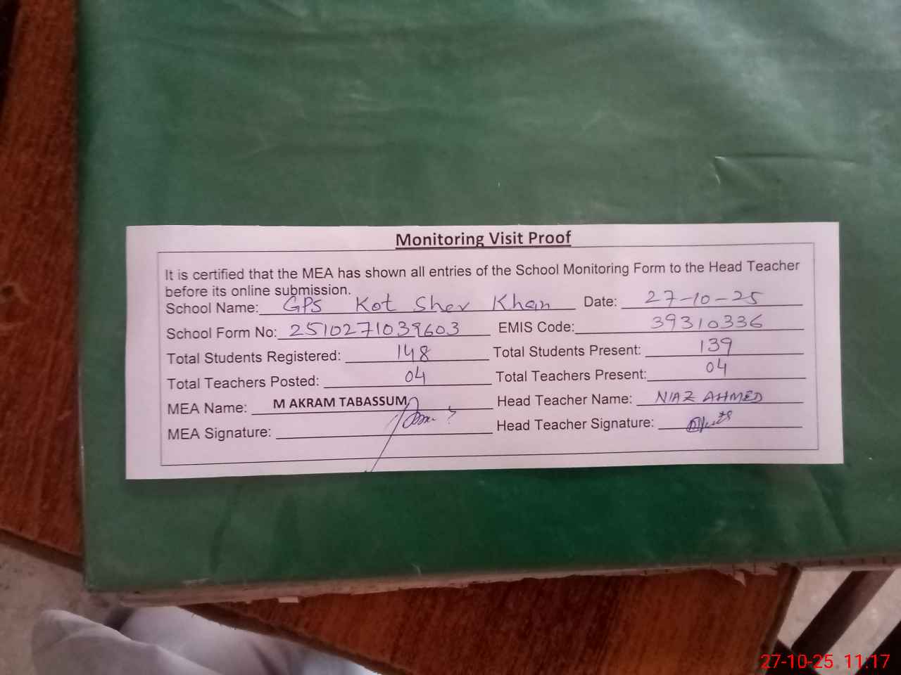 | Attendance Register | Head Teacher | MEA with School | Visit Proof |