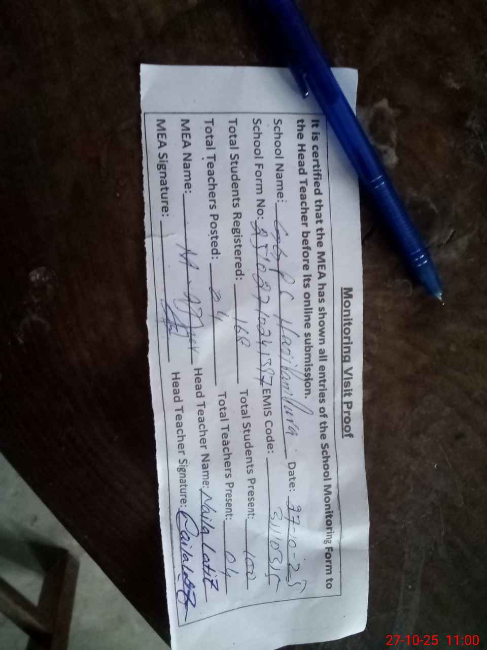 | Attendance Register | Head Teacher | MEA with School | Visit Proof |