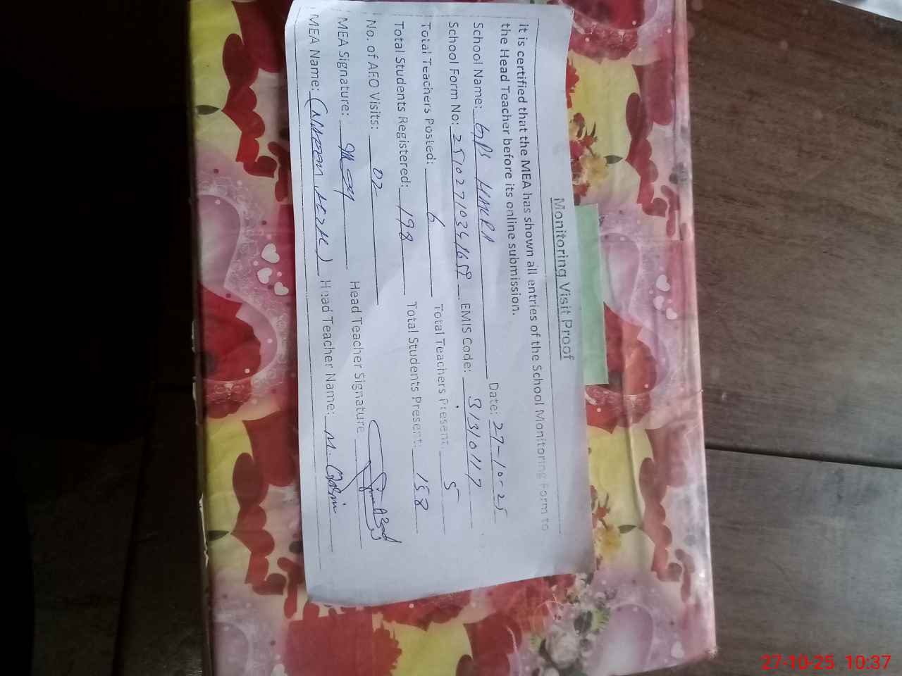 | Attendance Register | Head Teacher | MEA with School | Visit Proof |