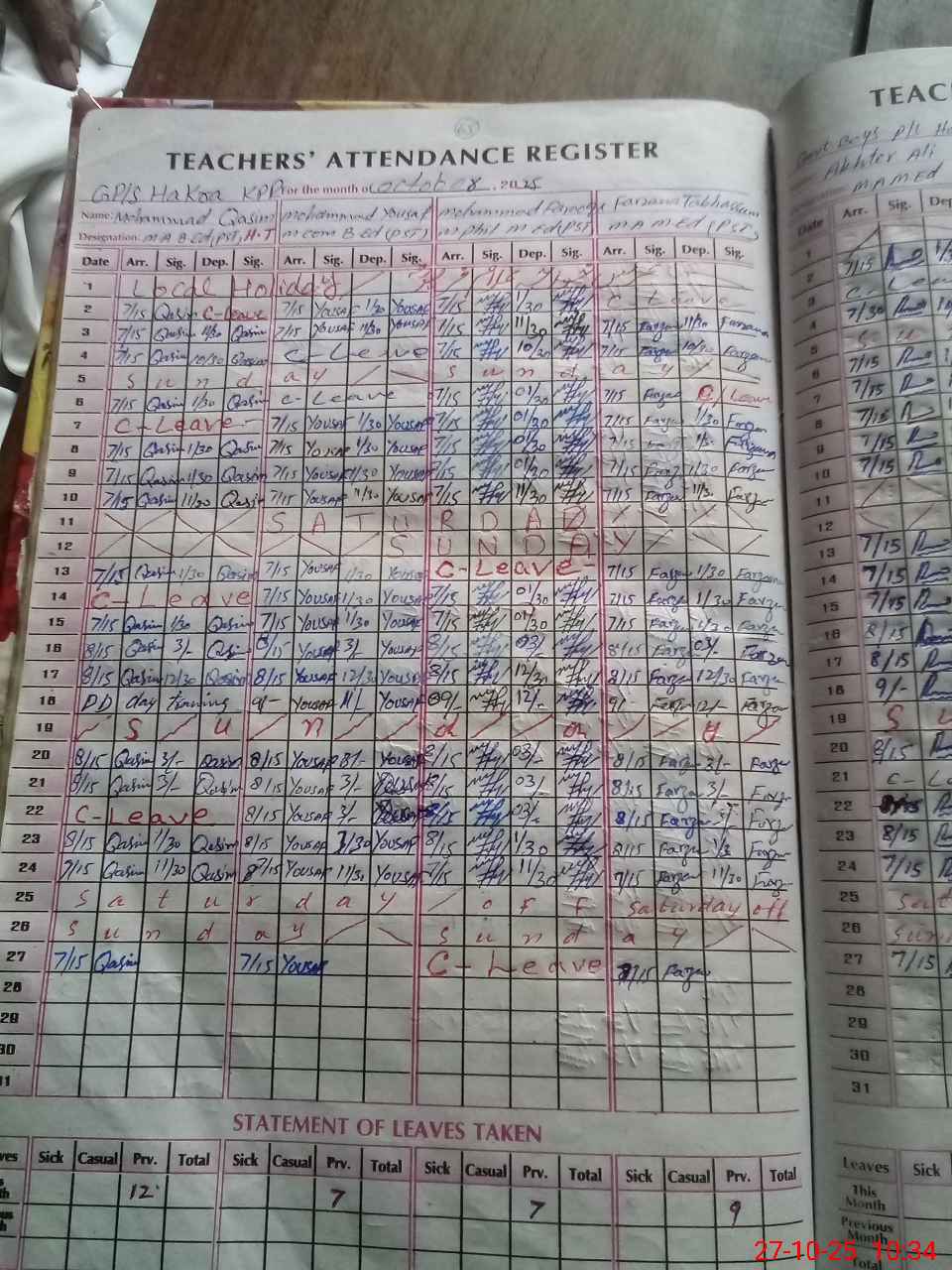 | Leave | Duty | Absent | Maternity | Medical | Ex- Pak |