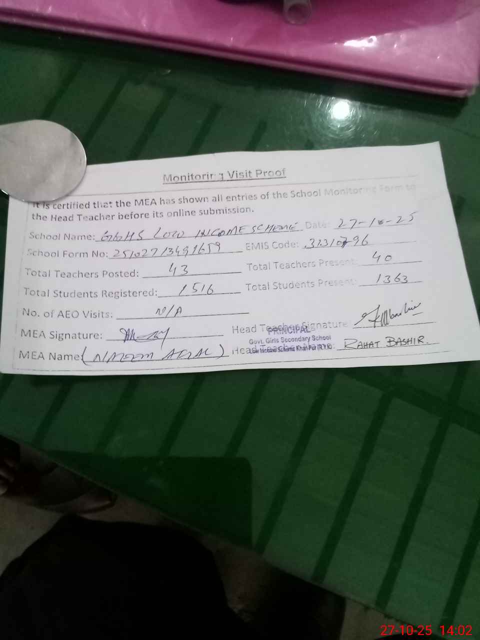 | Attendance Register | Head Teacher | MEA with School | Visit Proof |