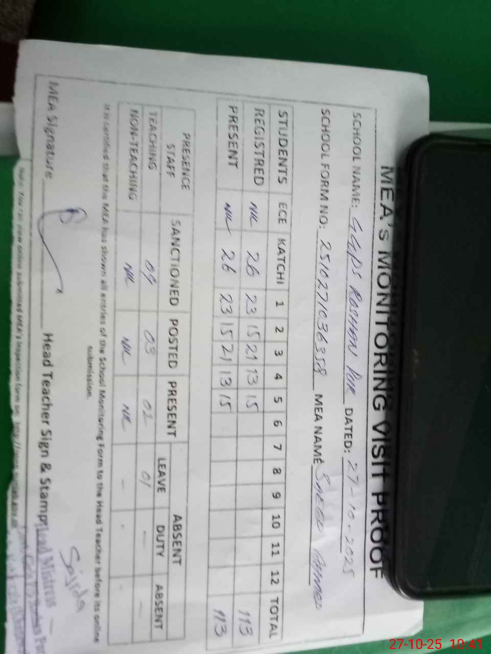 | Attendance Register | Head Teacher | MEA with School | Visit Proof |