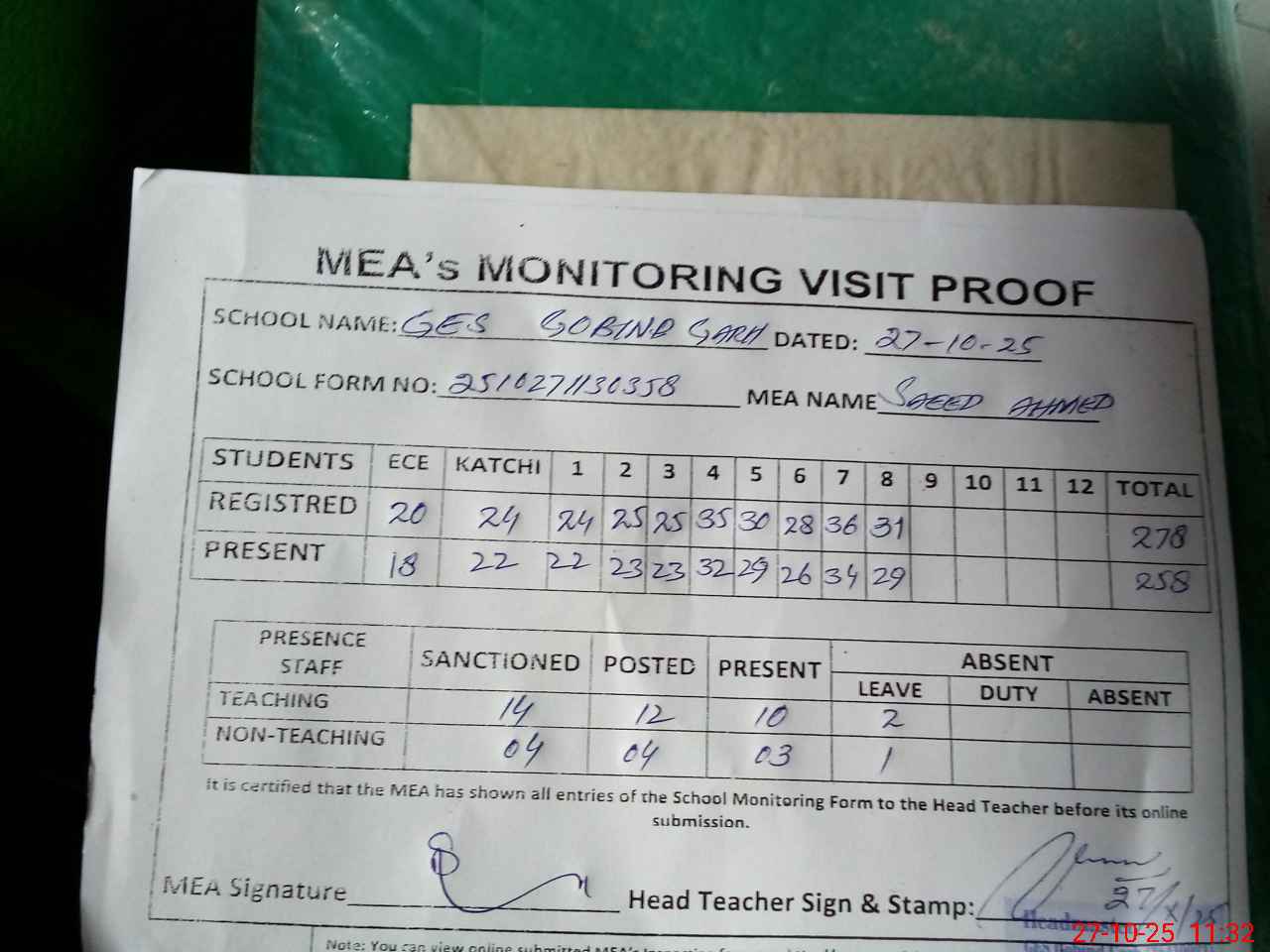 | Attendance Register | Head Teacher | MEA with School | Visit Proof |