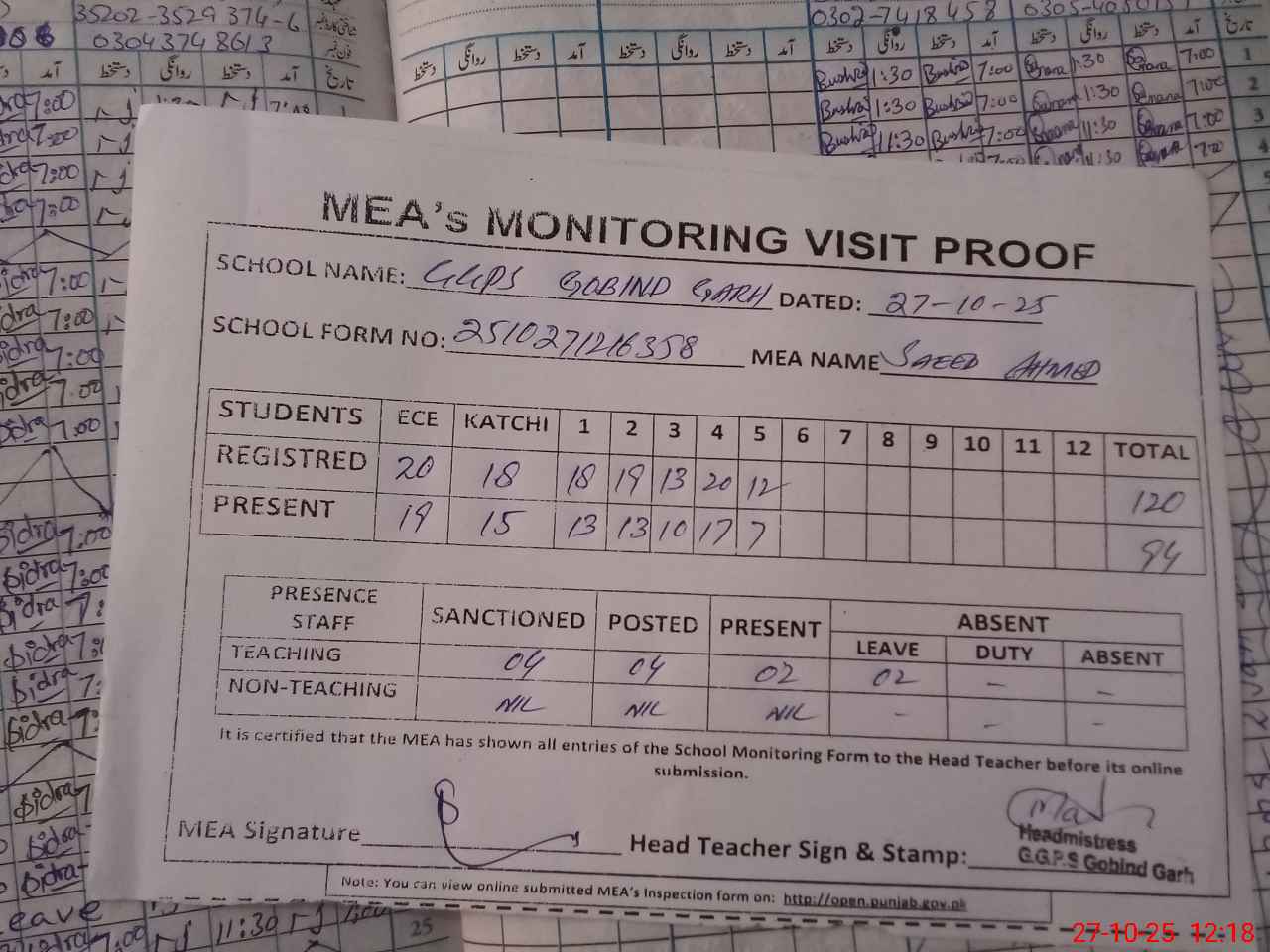 | Attendance Register | Head Teacher | MEA with School | Visit Proof |