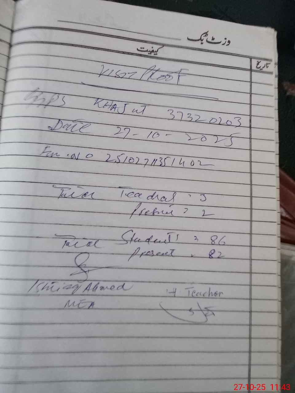 | Remarks (Use Separate Page if Required): Total teachers are 3 present teachers are 2 but under mentioned teacher named wajiha cnic no 370536678006 Zafar is absent from 25 June 2025 | |||||