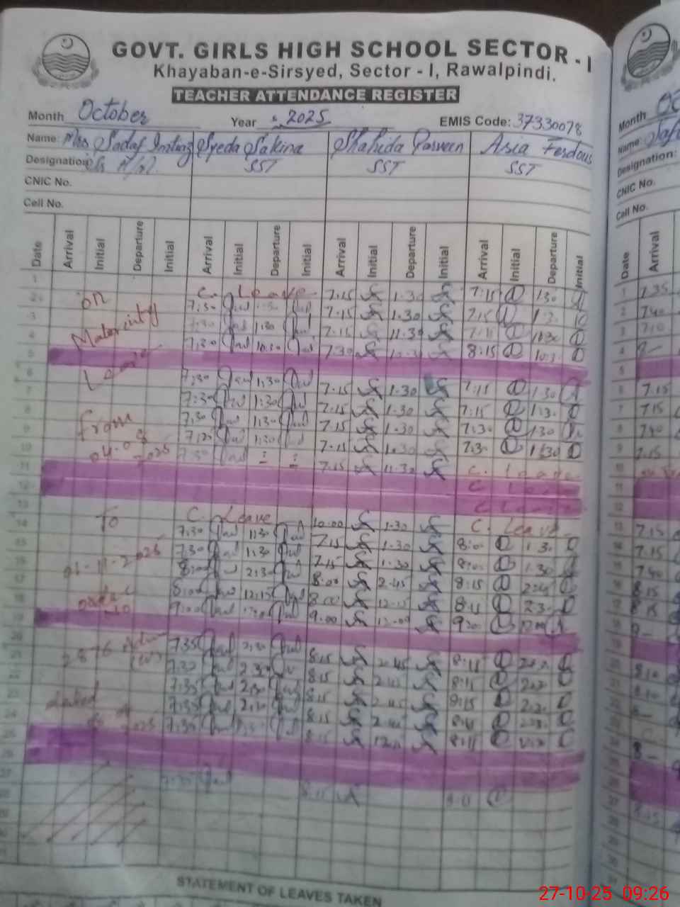 | EMIS Code: 37330078 | Name of School: GGHS KHAYABAN-I-SIR SYED SEC-I | |||