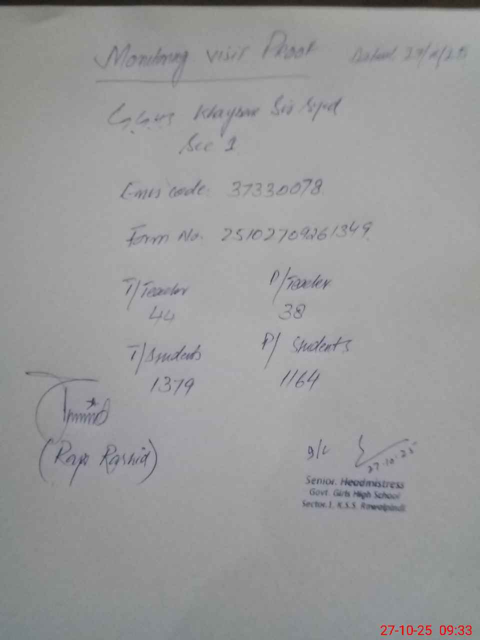 | Name: Mr**** Sa**** Im**** Designation: (School Headmaster's/Headmistress's) Sr Headmistress Phone/Cell Number: 03**** |