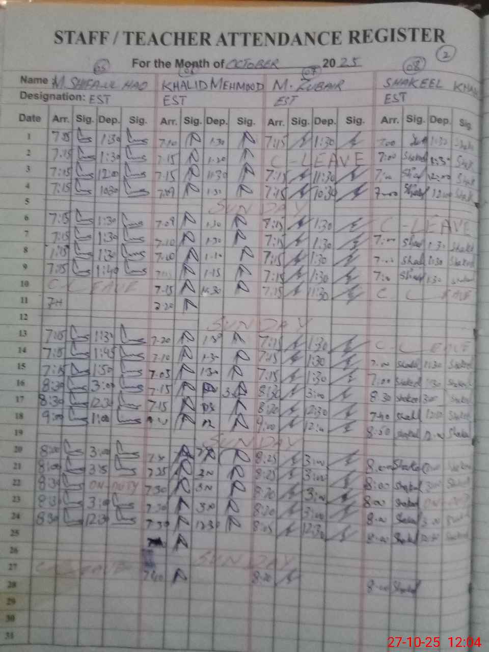 | Remarks (Use Separate Page if Required): Teacher Fahad Abdullah PST 3740501794731 is shown on attendance register but his name is not shown on sis and physically he is on dengue duty at DEO Woman Ee Teacher M Ayaz PST 3740247969593 is shown on attendance register but his name is not shown on sis Nsb record not updated on sis | |||||