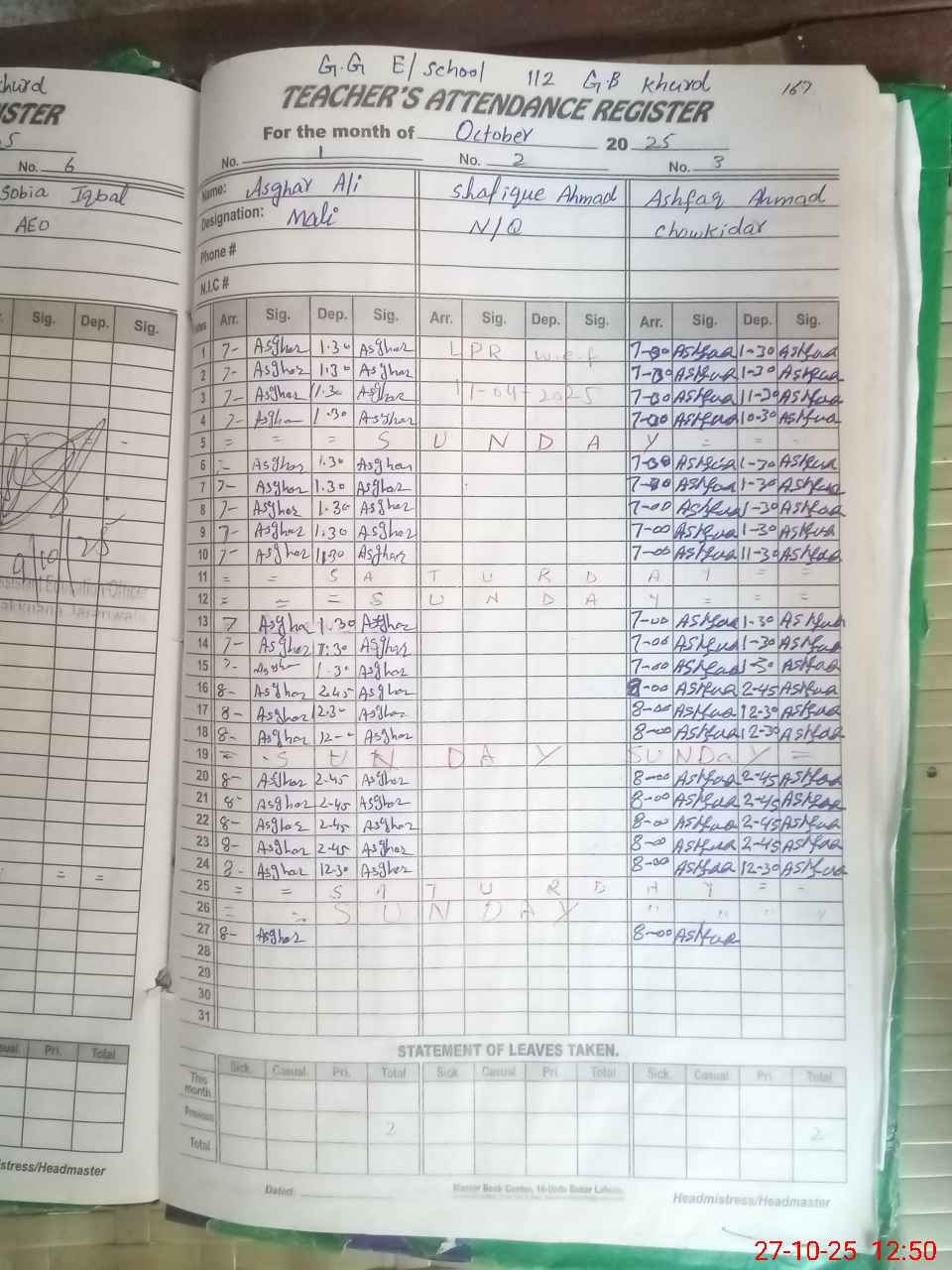 | CNIC | Full Name | Designation | R/C | Absence During Last Calender Month |