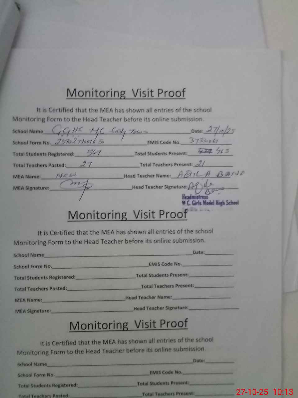 | Attendance Register | Head Teacher | MEA with School | Visit Proof |
