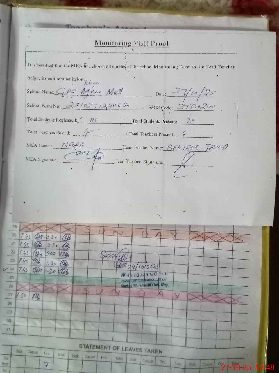 | Attendance Register | Head Teacher | MEA with School | Visit Proof |