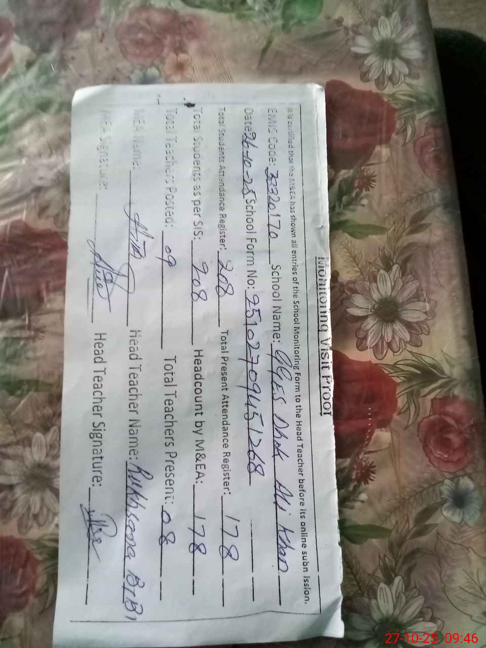 | Attendance Register | Head Teacher | MEA with School | Visit Proof |