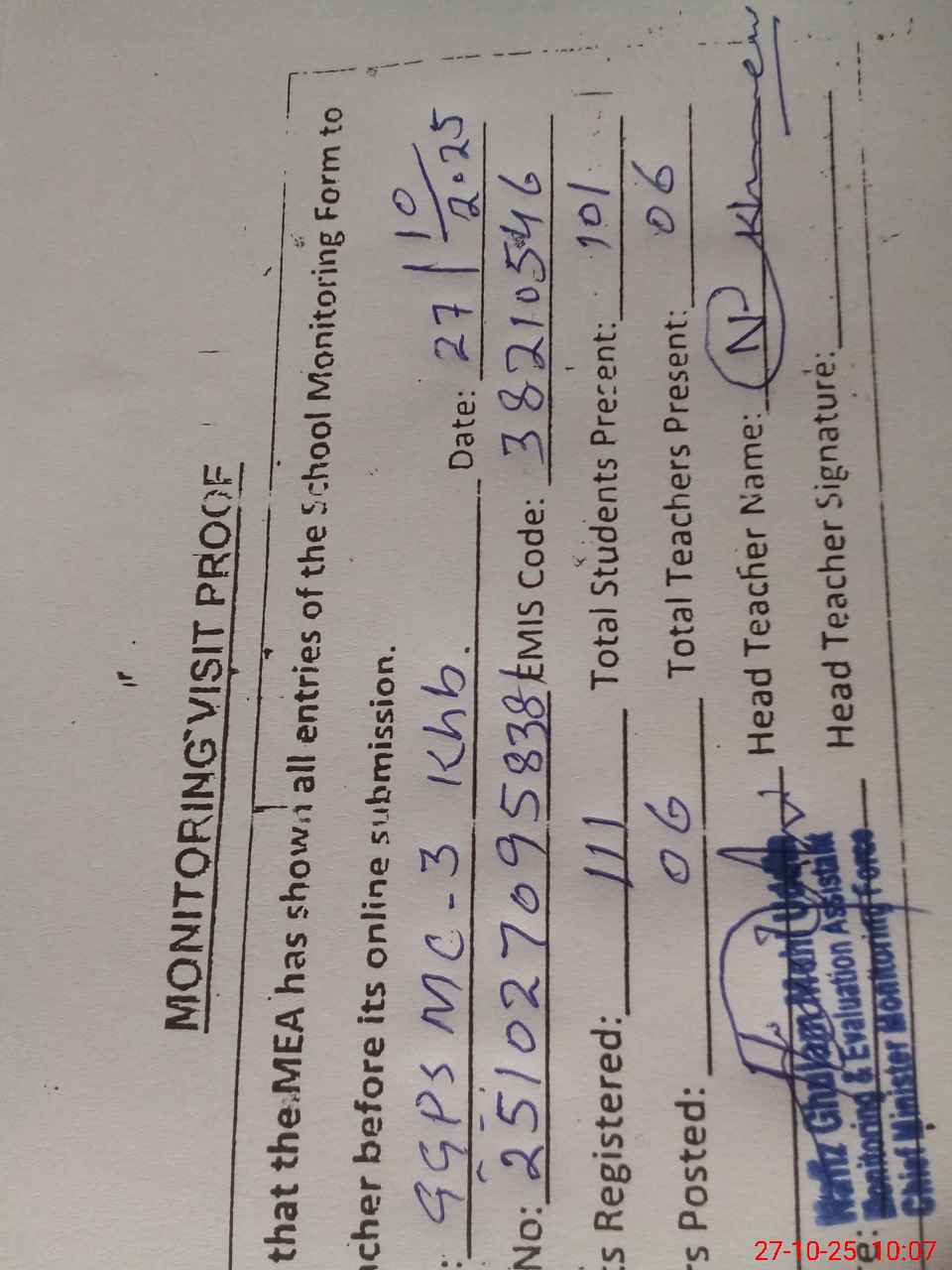| Monitoring Date: 27-10-2025 | Start Time: 27-10-2025 09:33 AM | End Time: 27-10-2025 10:07 AM | Name of MEA: HA**** GH**** MO**** UDDI**** | |