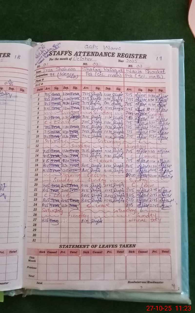 | Remarks (Use Separate Page if Required): O3 teacher are on official duty Kashmir black day | |||||