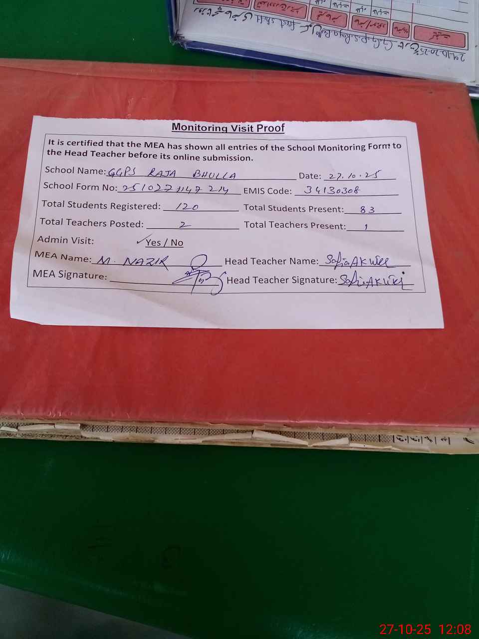 | Attendance Register | Head Teacher | MEA with School | Visit Proof |