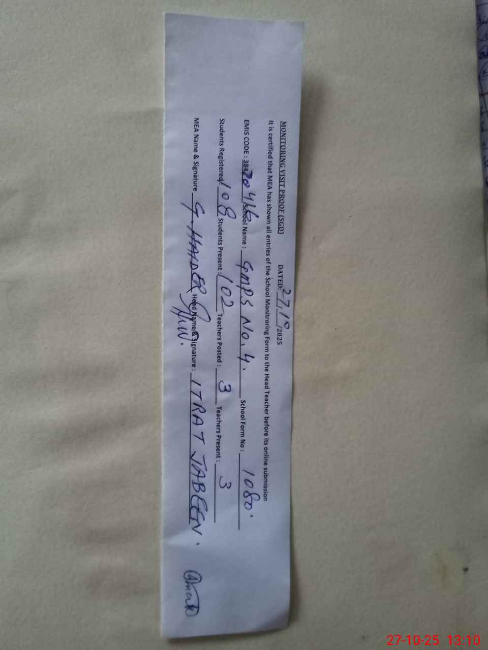 | Attendance Register | Head Teacher | MEA with School | Visit Proof |