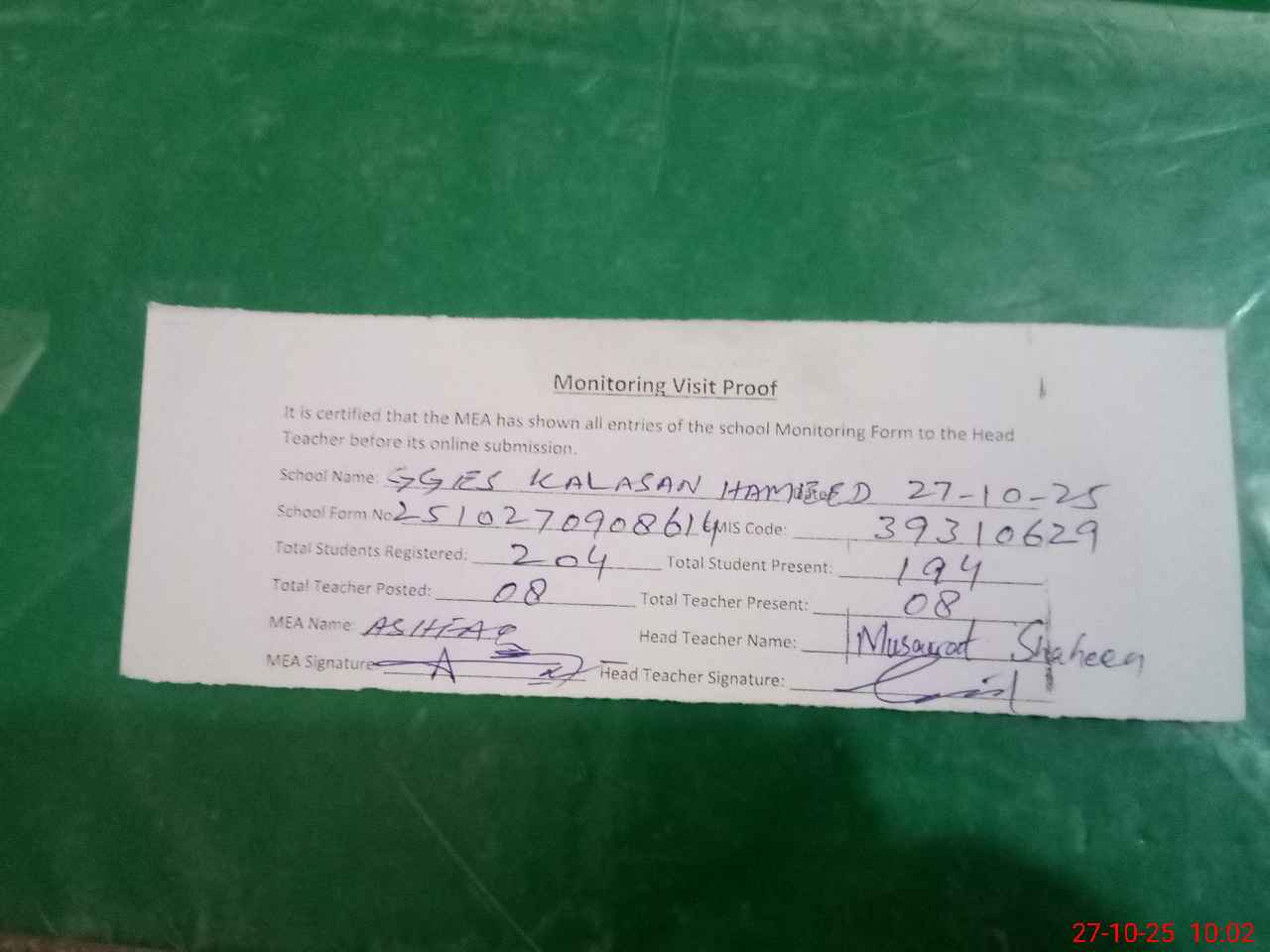 | EMIS Code: 39310629 | Name of School: GGES KALASAN HAMEED | |||