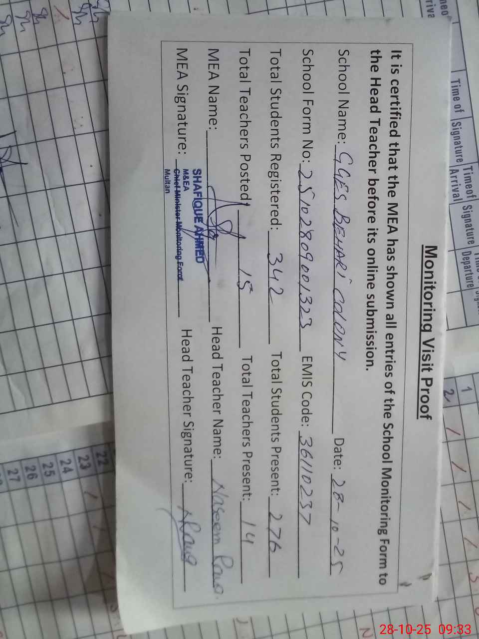 | Attendance Register | Head Teacher | MEA with School | Visit Proof |