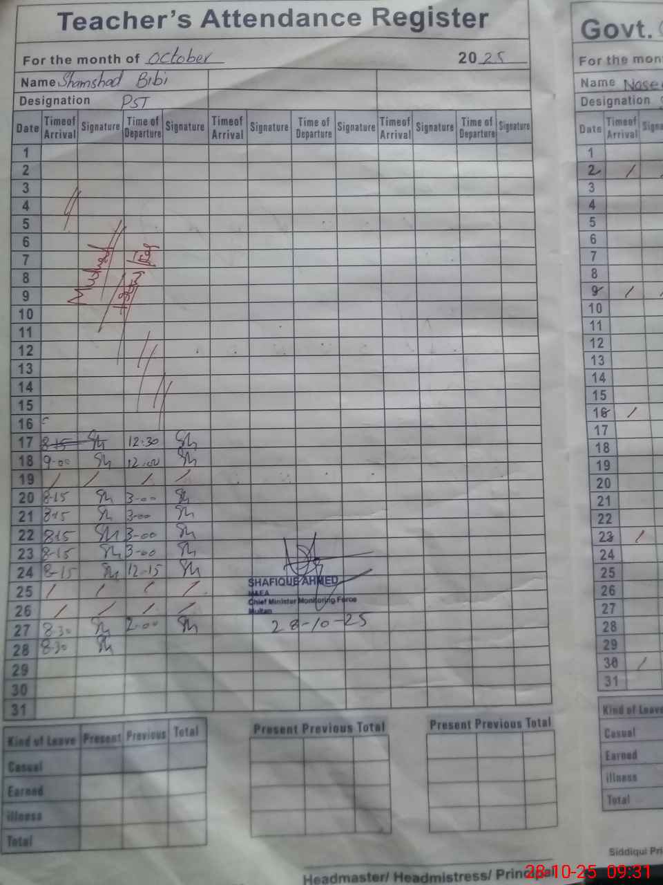 | Monitoring Date: 28-10-2025 | Start Time: 28-10-2025 09:00 AM | End Time: 28-10-2025 09:34 AM | Name of MEA: SH**** AH**** | |