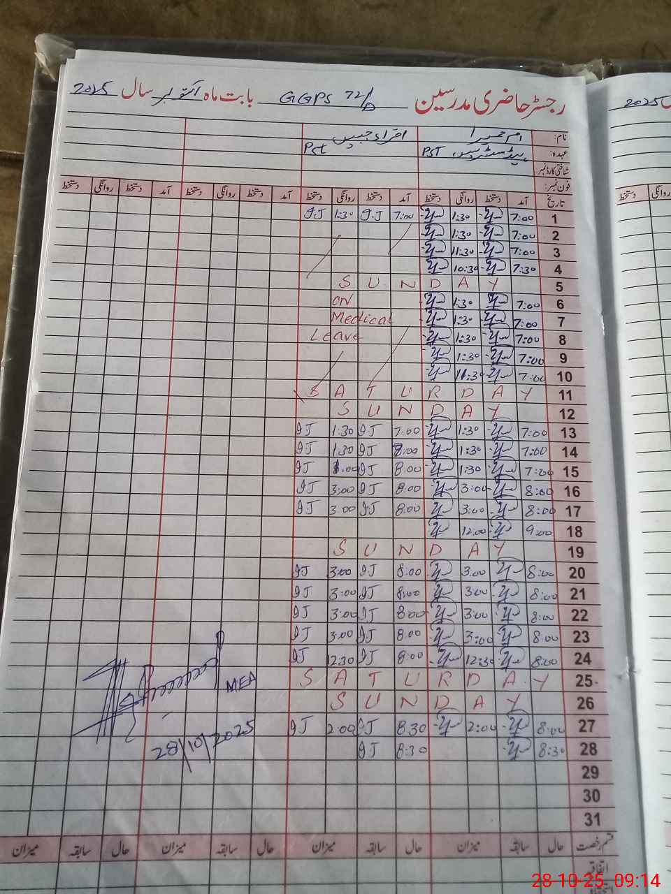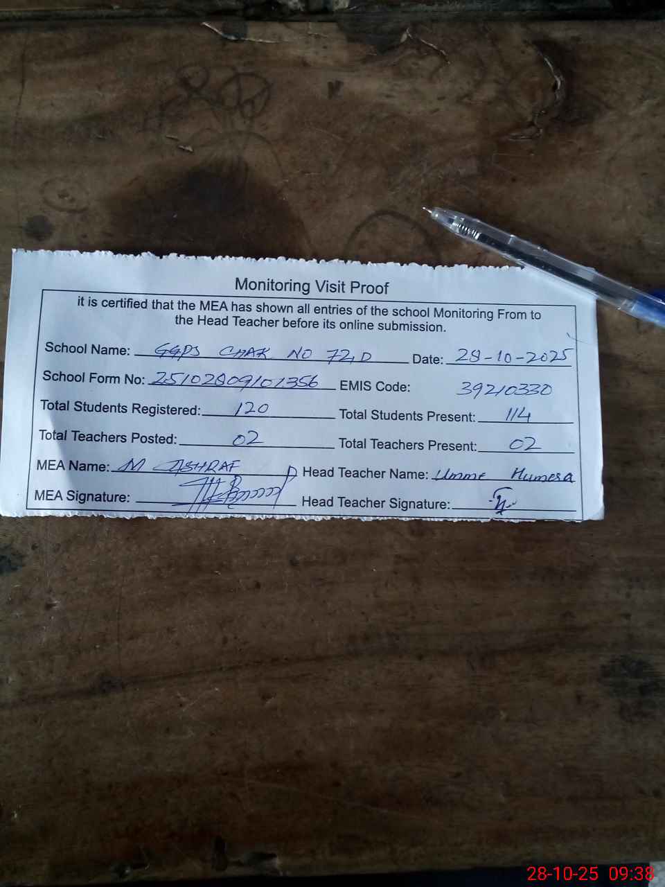 | Attendance Register | Head Teacher | MEA with School | Visit Proof |
