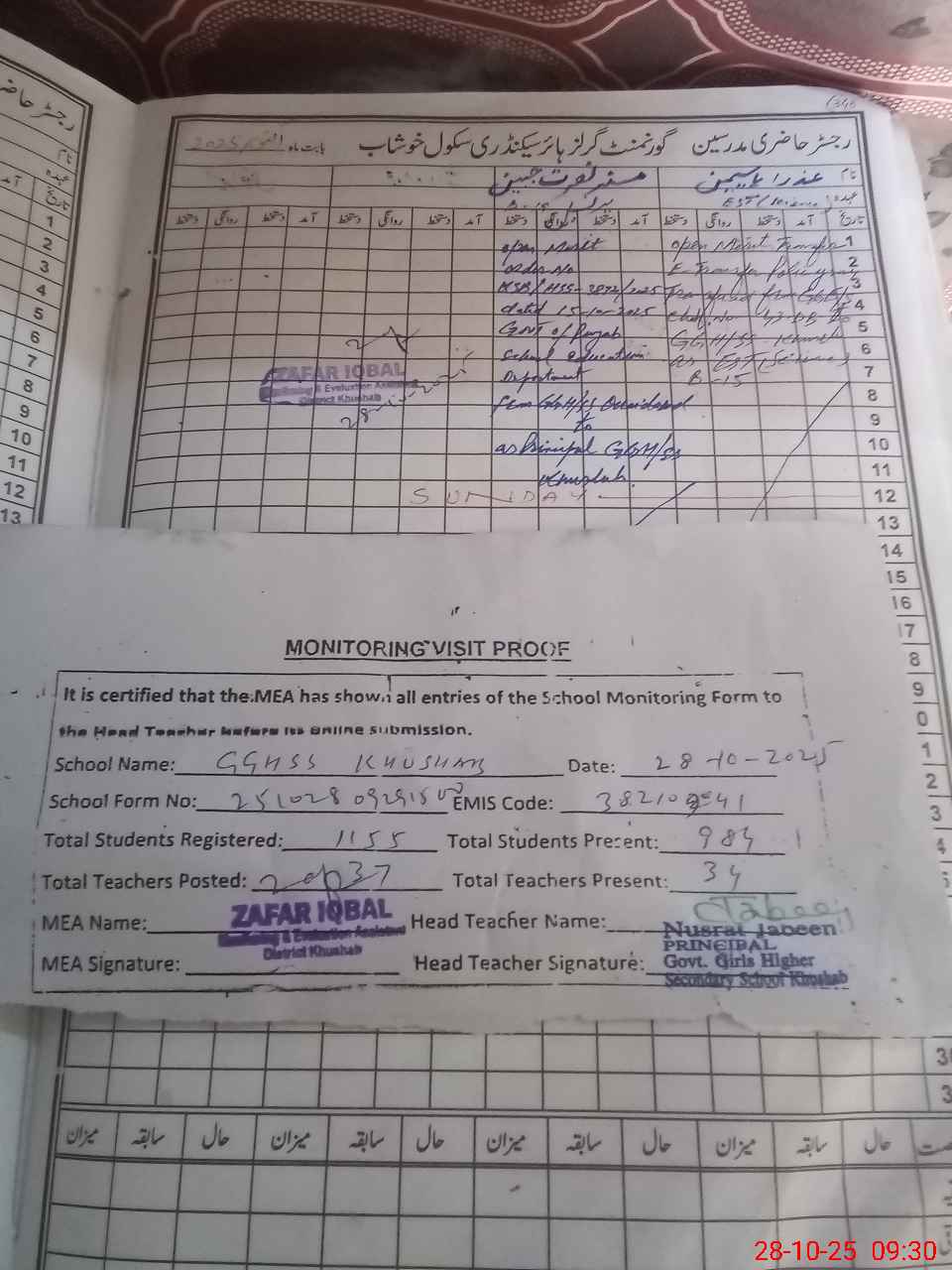 | Attendance Register | Head Teacher | MEA with School | Visit Proof |