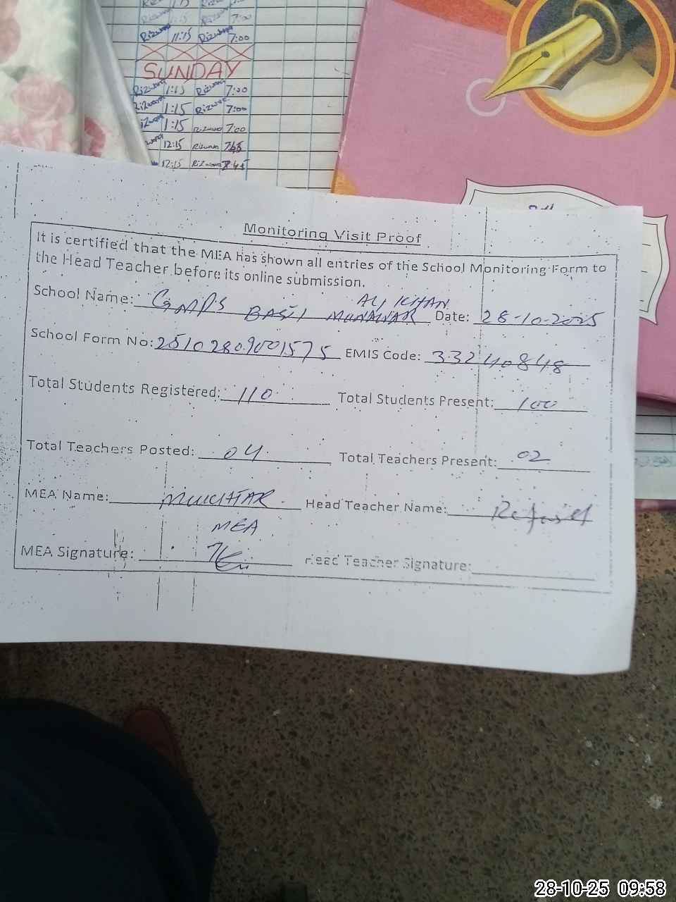| Attendance Register | Head Teacher | MEA with School | Visit Proof |