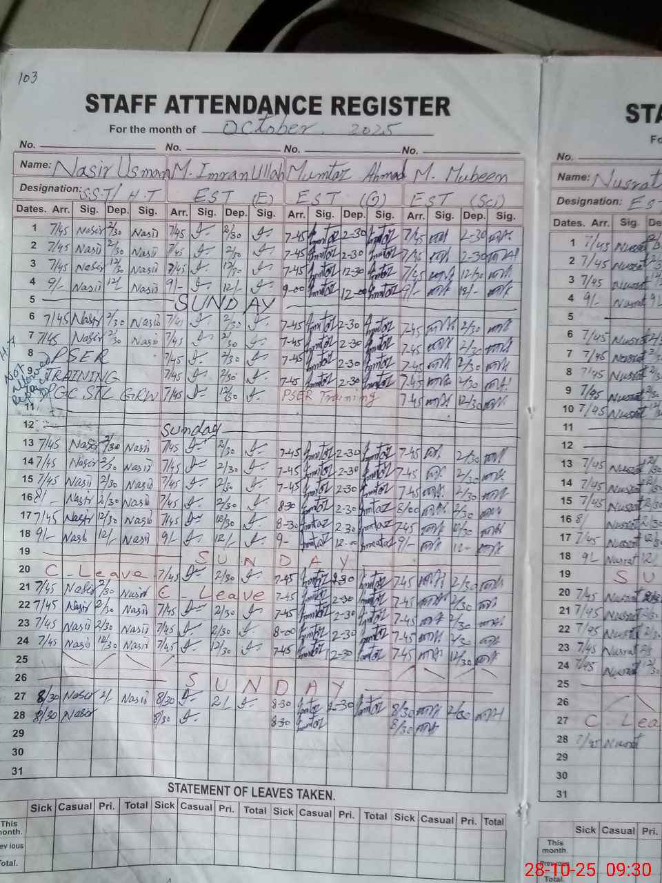 | 34**** | Na**** Us**** | 5 | 1 | 0 | 0 | 0 | 0 | 0 | 0 | 0 | 0 | 0 | Absent (Un-Authorized) |