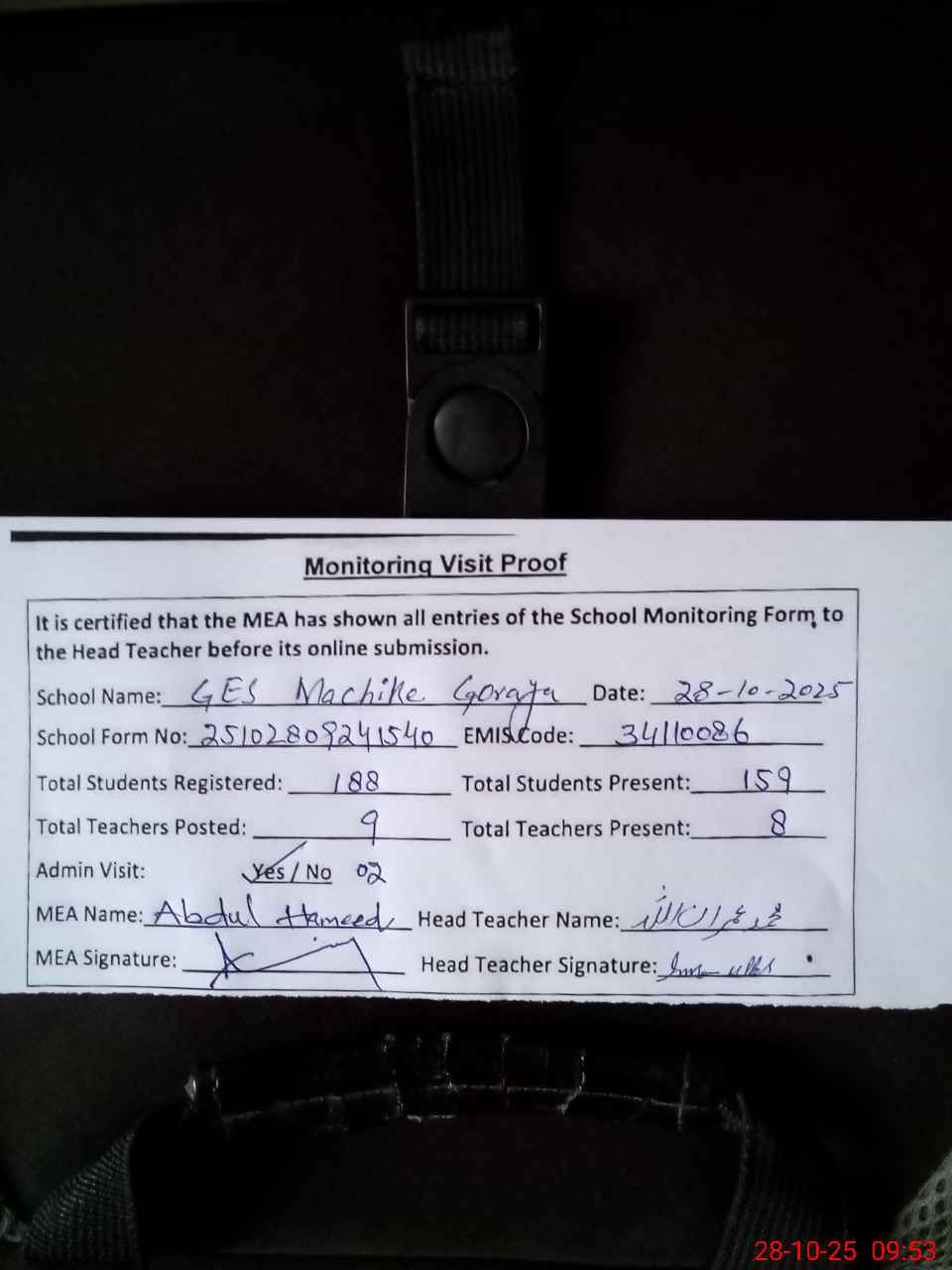 | Attendance Register | Head Teacher | MEA with School | Visit Proof |