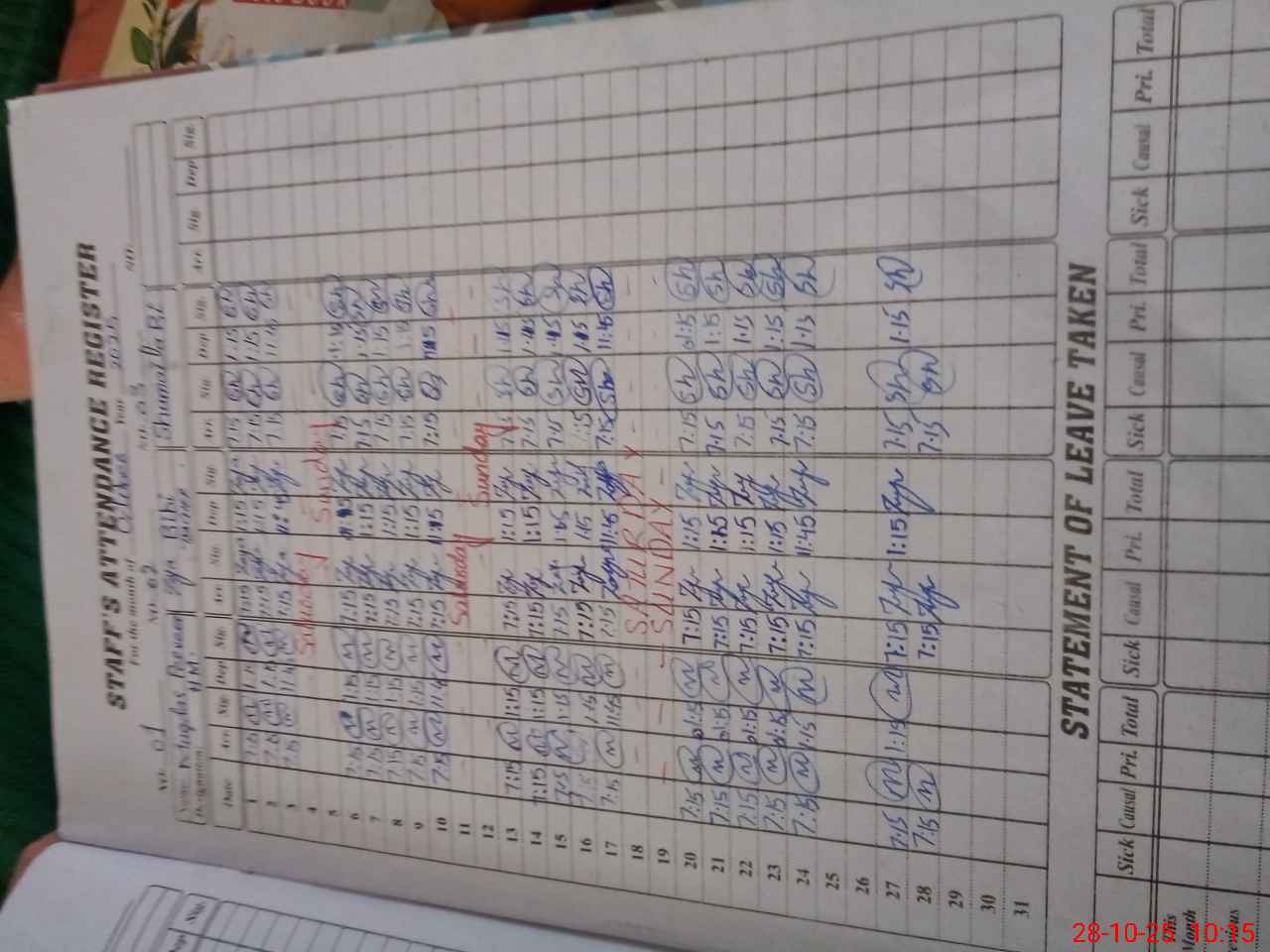 | Leave | Duty | Absent | Maternity | Medical | Ex- Pak |