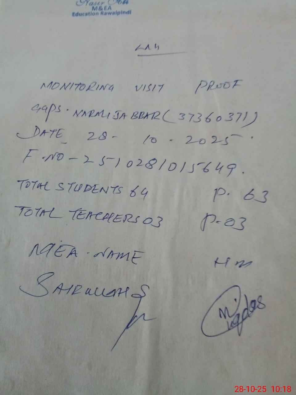 | Name: Gh**** Fa**** Designation: (School Headmaster's/Headmistress's) PST Phone/Cell Number: 03**** |
